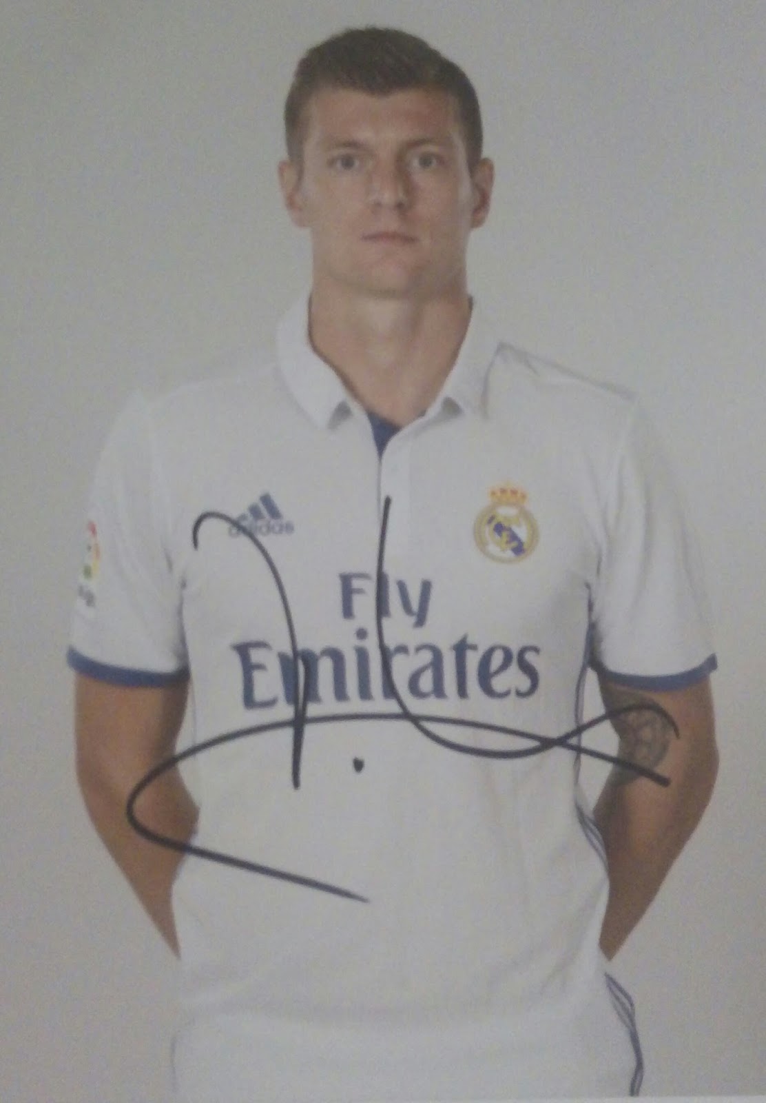 Na wstępie autograf jednego z najlepszych środkowych pomocników świata-Toniego Krossa. Kross jest pomocnikiem Realu Madryt, na jego trykocie widnieje numer ósmy. Zanim trafił do Hiszpani, grał w Bundeslidze, a dokładniej w Bayerze Leverkusen oraz w zespole mistrza Niemiec, Bayernie Monachium. Warto zaznaczyć, że Niemiec jest mistrzem świata z 2014 roku. Autograf ten zdobyłem, pisząc na adres agencji piłkarza, który mogę podać chętnym osobom. Czas oczekiwania to 2-3 tygodnie.